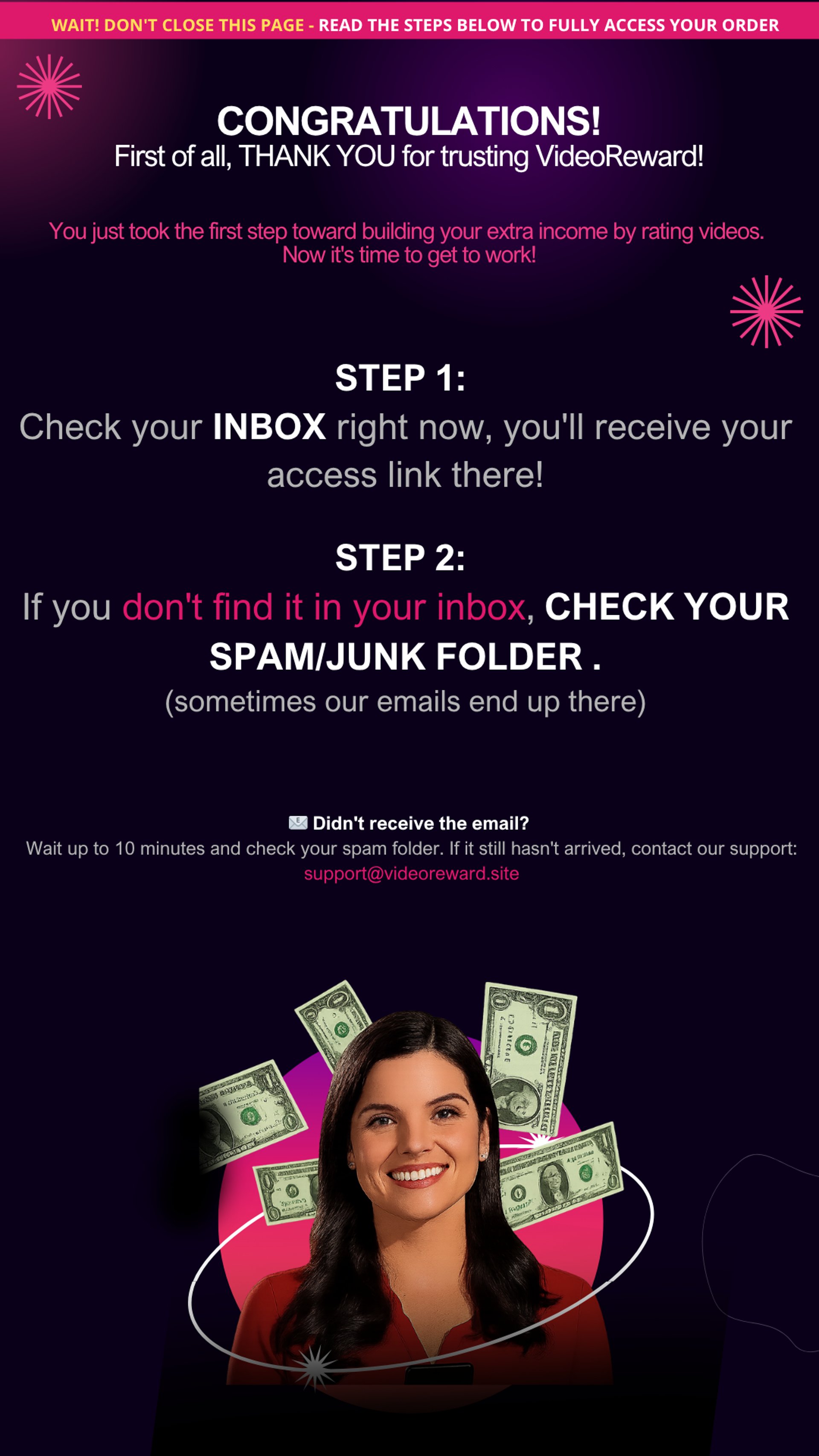 Q3: Where can I get support for access issues? A: If you cannot find your access link after checking your spam folder, please contact our dedicated support team directly at support@videoreward.site. Please include the name and email used for your purchase.
